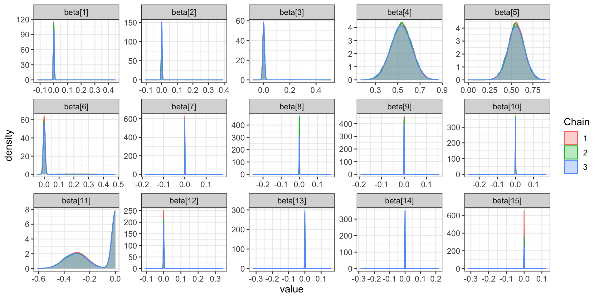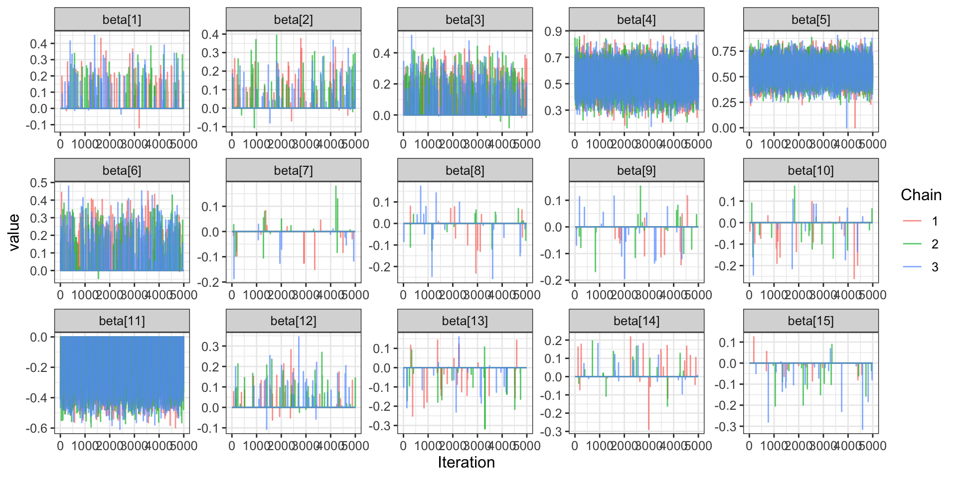 library(nimble)library(magrittr)library(ggplot2)library(coda) # for summarizing and plotting of MCMC output and diagnostic testslibrary(ggmcmc) # MCMC diagnostics with ggplot# data ########################################################################N <-100p <-15set.seed(123)X <-matrix(rnorm(N*p), nrow = N, ncol = p)true_betas <-c(c(0.1, 0.2, 0.3, 0.4, 0.5),rep(0, 10))y <-rnorm(N, X%*%true_betas, sd =1)# standard linear regression ##################################################summary(lm(y ~ X))