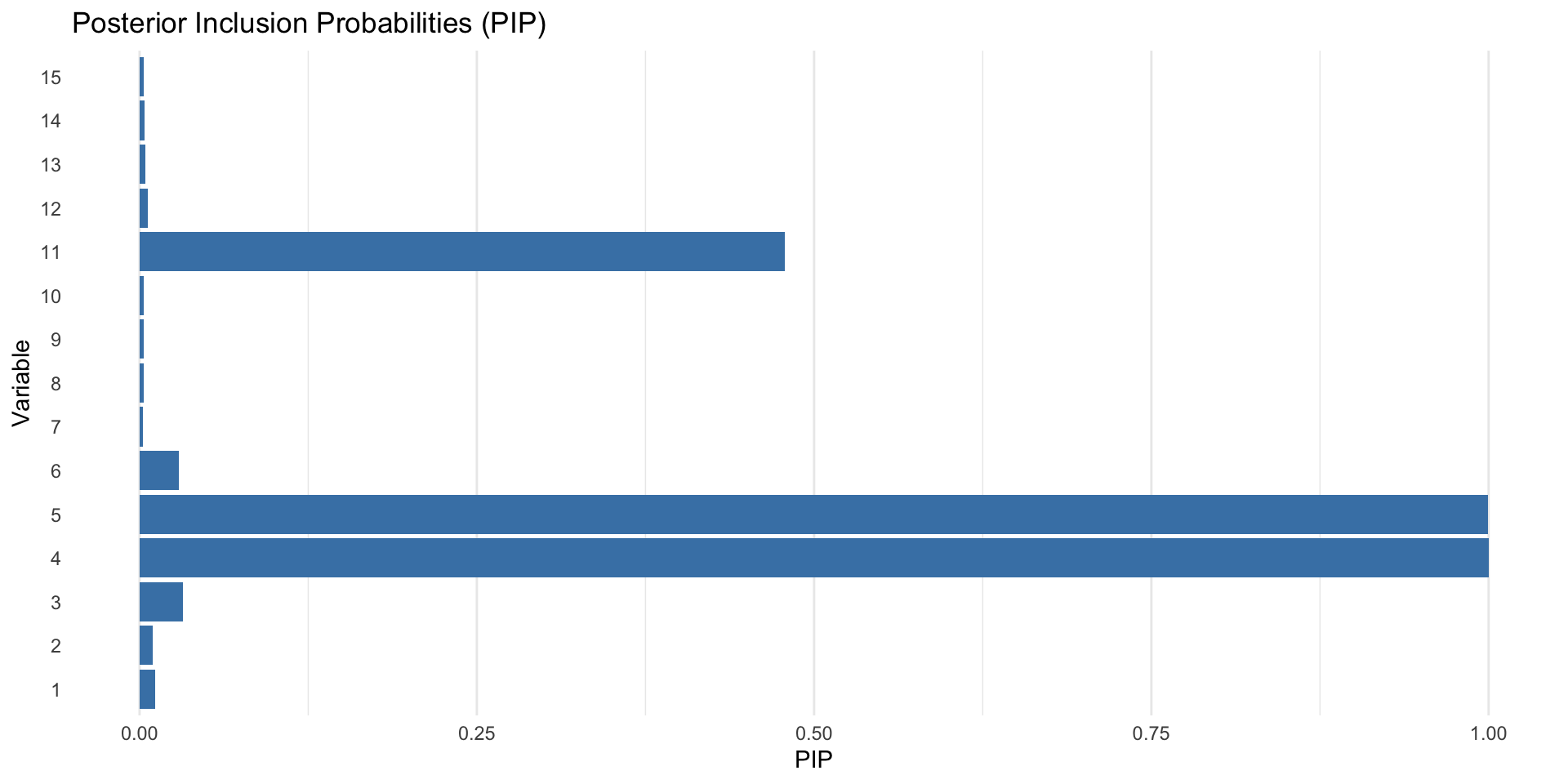 The spike-and-slab prior is a two-point mixture distribution on \(\beta_j\): \[\beta_j\sim (1 - \gamma_j)\color{steelblue}{\phi_0(\beta_j)} + \gamma_j\color{orange}{\phi_1(\beta_j)}\]
